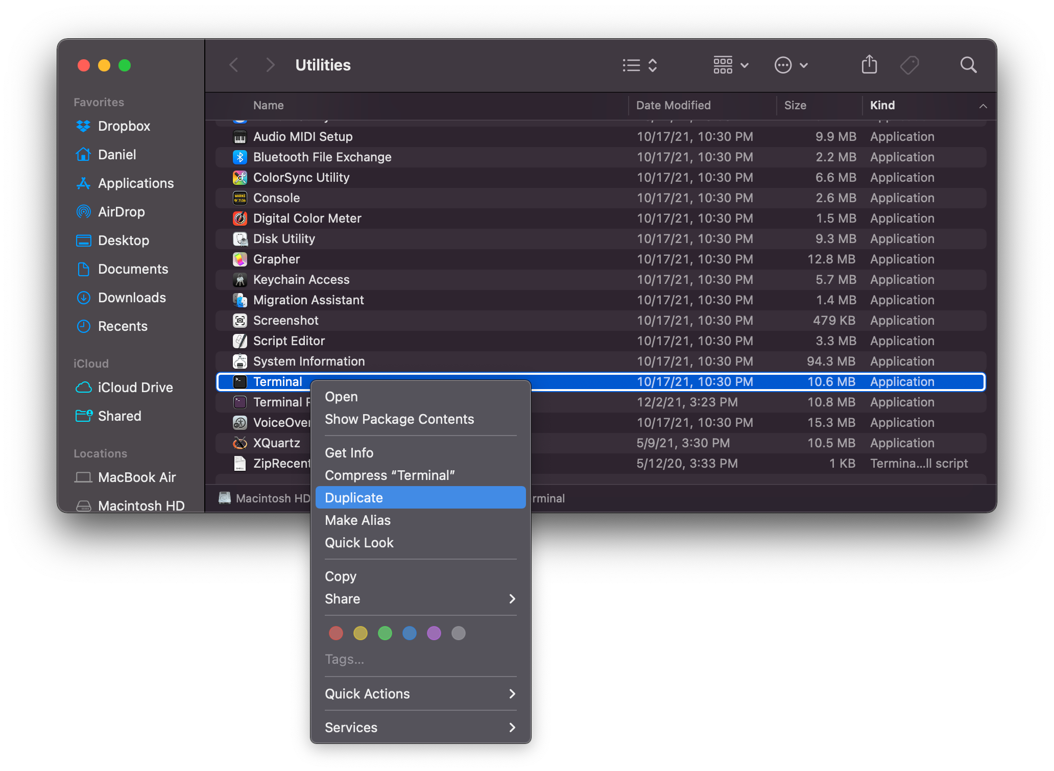 Now we need a way to run commands using Rosetta. First, duplicate the Terminal app. Navigate to /Applications/Utilities and duplicate Terminal: