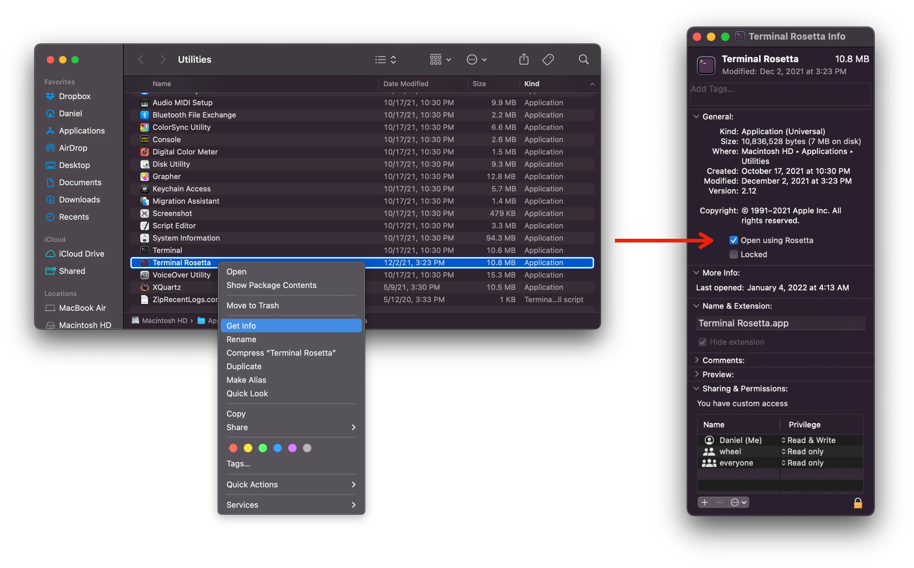 Then rename the new copy to something like “Terminal Rosetta”. Next, right click on the new Terminal, click “Get Info” and check the “Open using Rosetta” box: