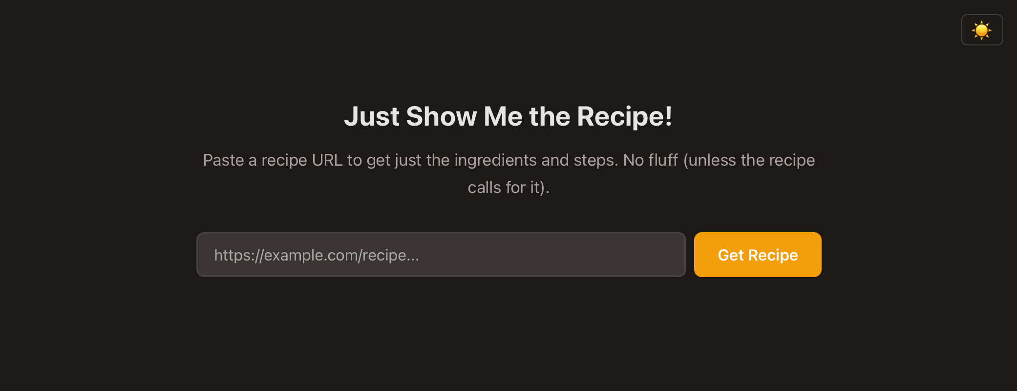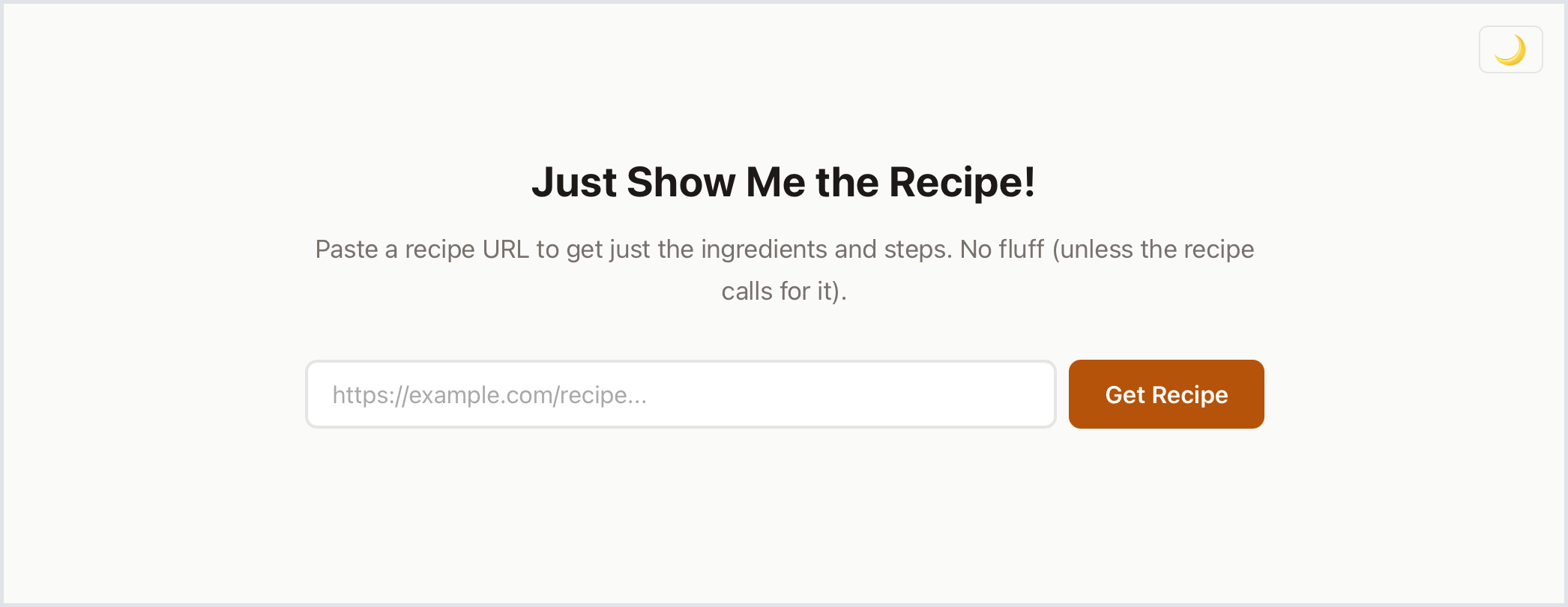 So I built a web app to take any1 online recipe and strip it down to just the ingredients and steps. It’s intentionally minimal: a simple landing page and a two-column recipe page.