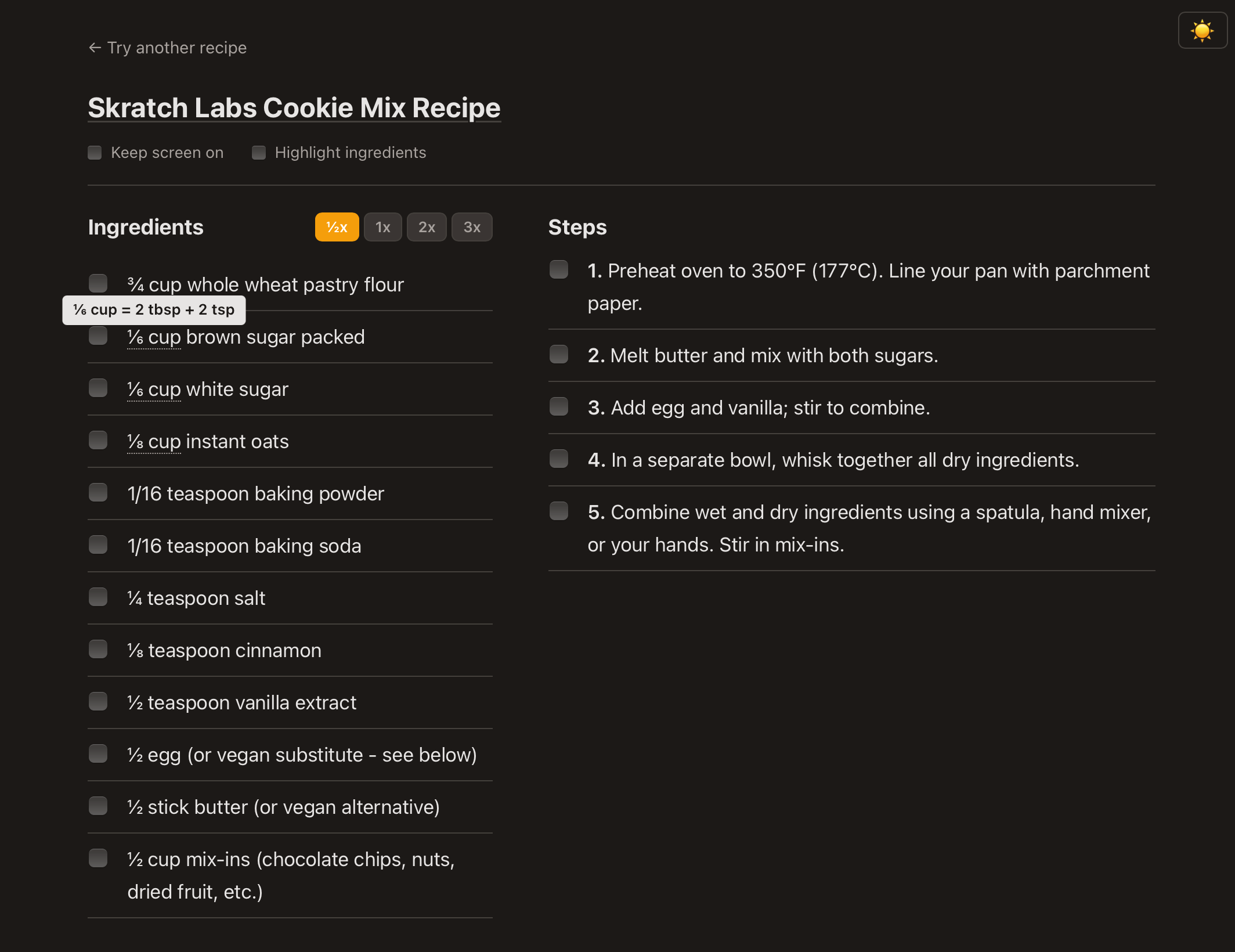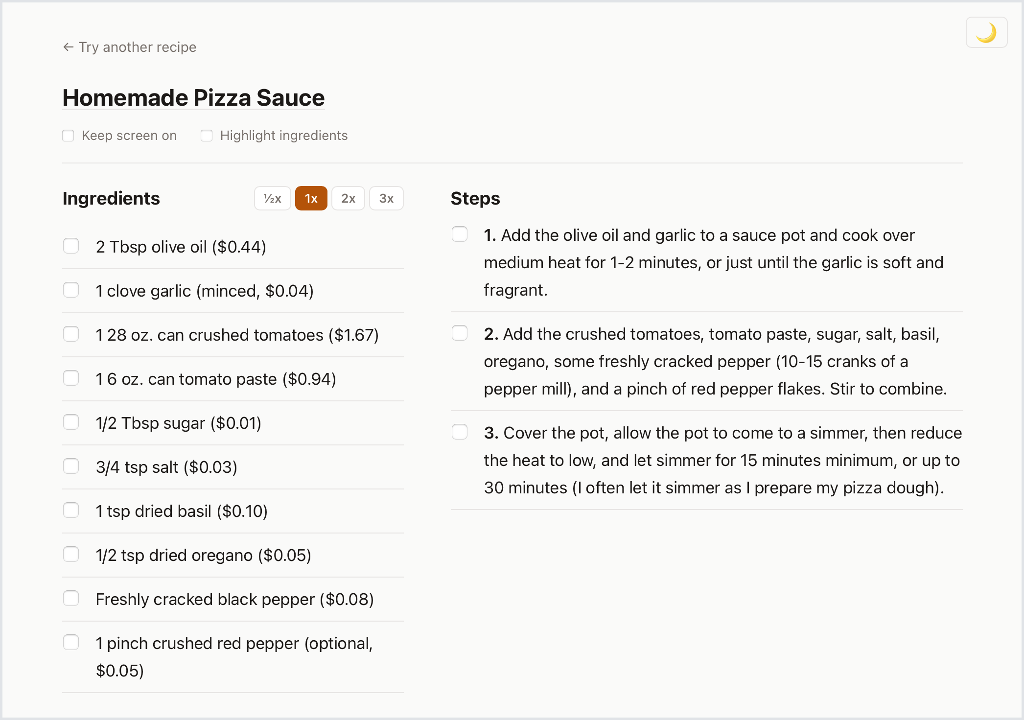Another feature that lots of recipe websites have. I added buttons on the recipe page to scale the recipe up or down (preset values of 1/2x, 1x, 2x, and 3x). When you choose a different scale, all of the ingredient amounts are updated.
