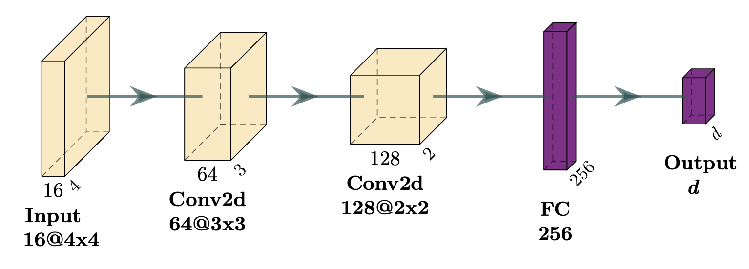 Prediction target: We can use DRL for either Q-learning or afterstate learning3. That choice determines our output dimension (\( d \) from neural network visual). For Q-learning, we use \( d = 4 \), one output node for each possible action. For afterstate learning, we use \( d = 1 \) since we’re predicting the value of the (after)state, not each action.