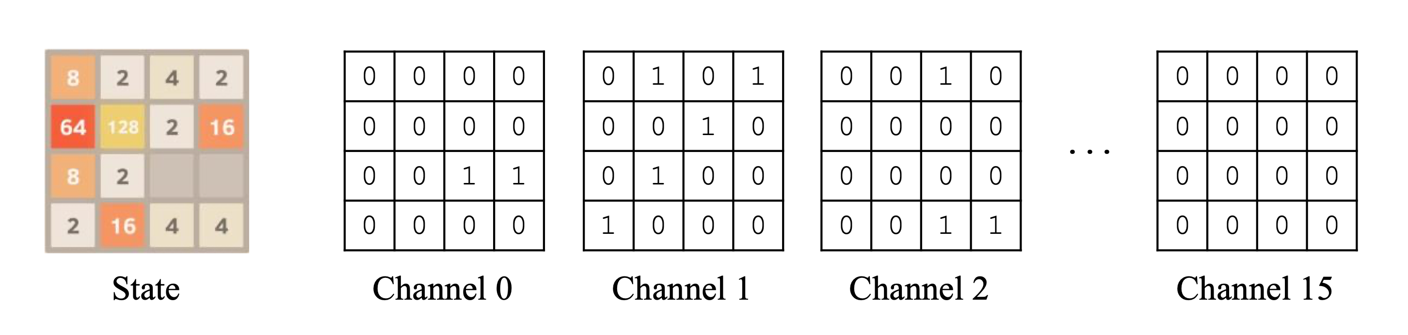 State representation: We represent the board as a 16x4x4 tensor, where each of the 16 channels is a one-hot encoding of a tile value. That is, all of the empty tiles have a 1 in their grid position on the first channel, the 2-tiles have a 1 in their position on the second channel, and so on.