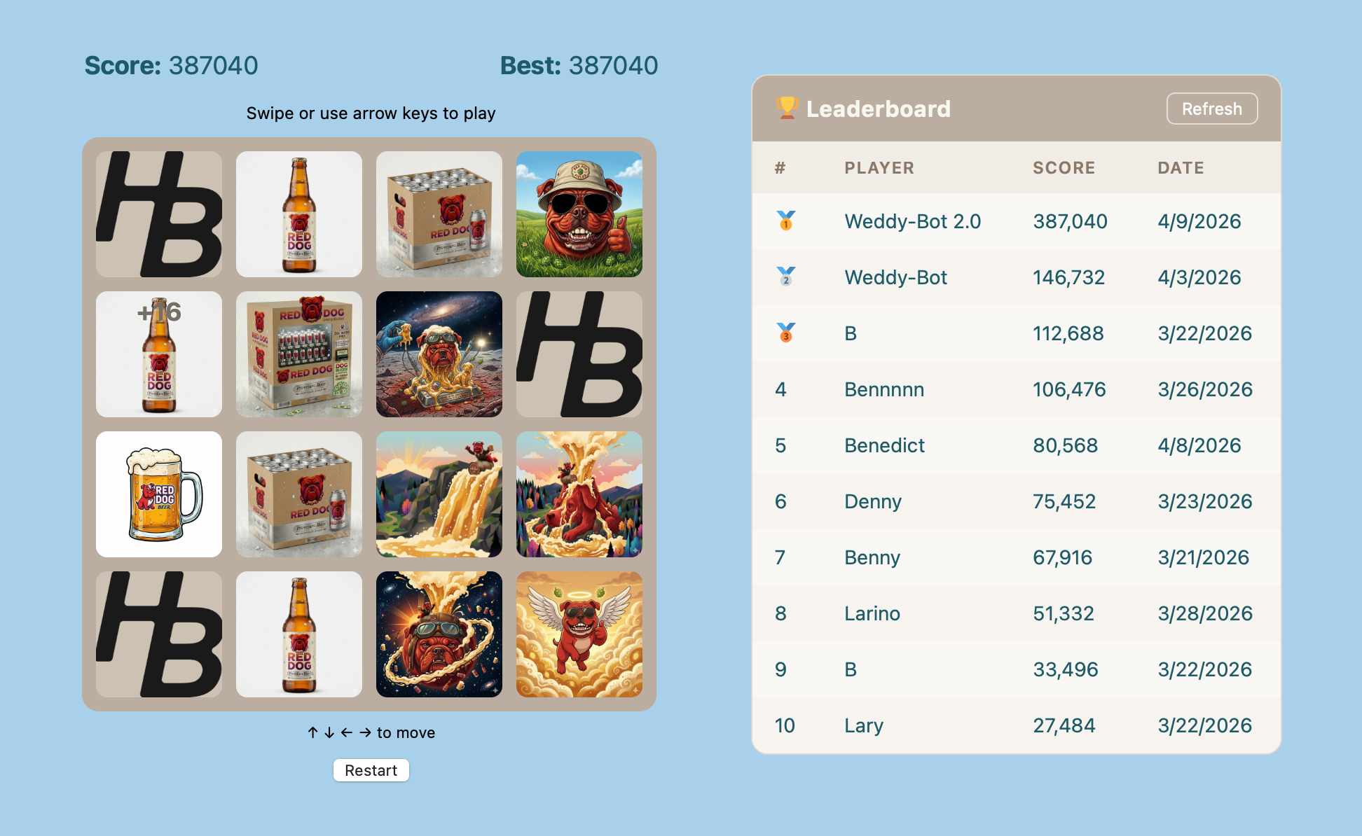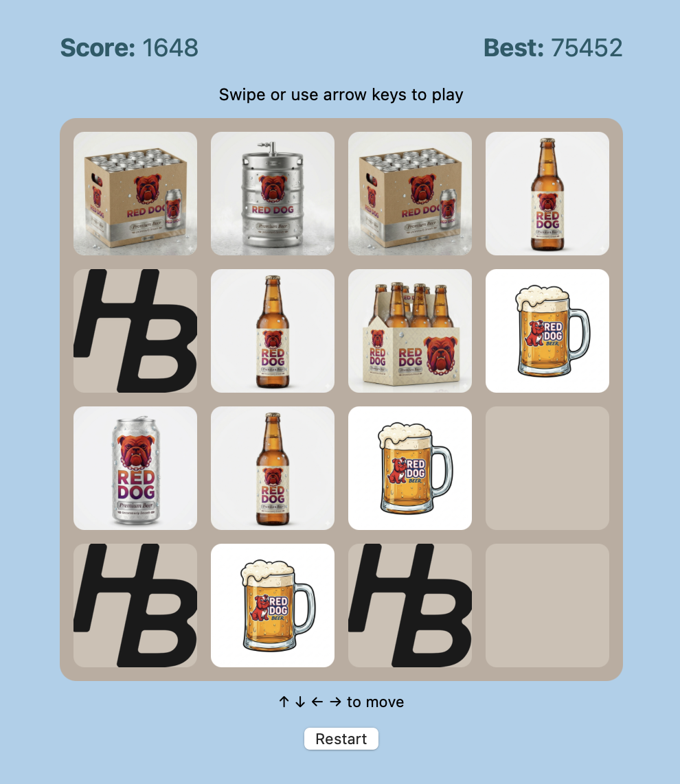 About that custom implementation: it’s an homage to an obscure, out-of-production, “uncommonly smooth” beer called Red Dog. Instead of numbered tiles, each tile is a Red Dog-themed image. Cans merge into bottles, bottles into 6-packs, into 12-packs, into kegs, and so on. There are Red Dog waterfalls and volcanoes and planets. It’s beautiful.